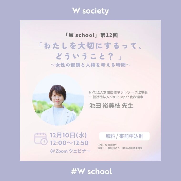 W society プロジェクトは、自身のキャリアとライフスタイルに向き合う女性たちに向け、12月10日(水)に開催する「女性のカラダとヘルスケア、それらとキャリアとの両立に関して知り、学ぶ機会」を提供するライフデザインセミナー「W school」第12回の申し込み受付をスタートしました。